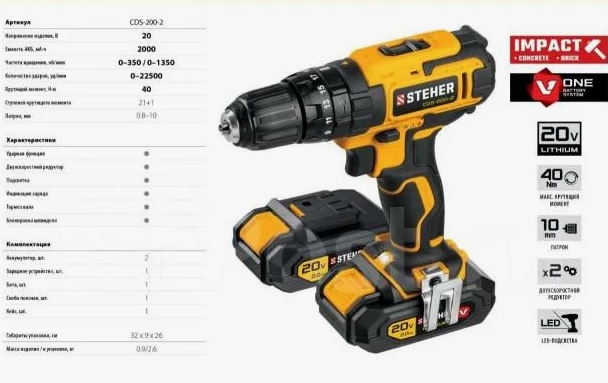 STEHER V1, 20 В, 40 Н·м, 2 АКБ (2А·ч), дрель-шуруповерт, кейс (CD-200-2)