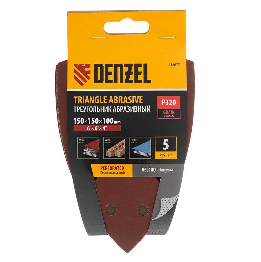 Р320. Треугольник абразивный на ворc. подложке под "липучку", перф., P 320, 150х150х100 мм, 5 шт.// Denzel