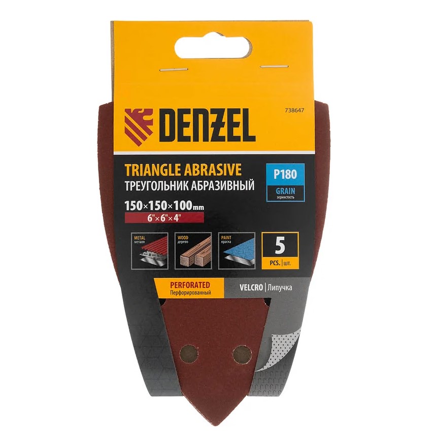 Р180. Треугольник абразивный на ворc. подложке под "липучку", перф., P 180, 150х150х100 мм, 5 шт.// Denzel